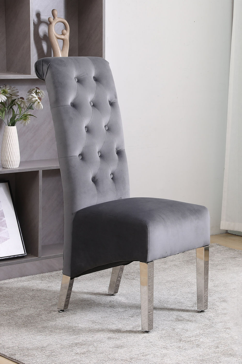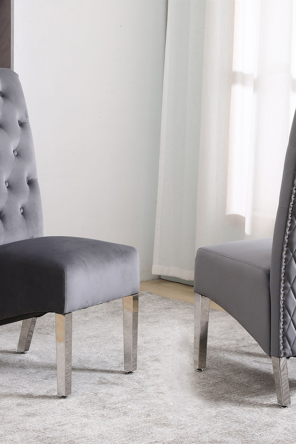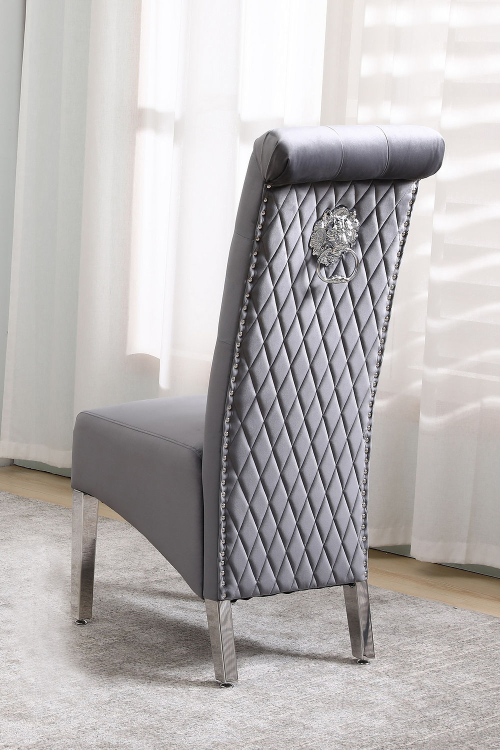 Silla de comedor de terciopelo gris con costuras con diseño de rombos, capitoné profundo, aldaba de león, patas de cromo pulido y detalles de cabeza de clavo.