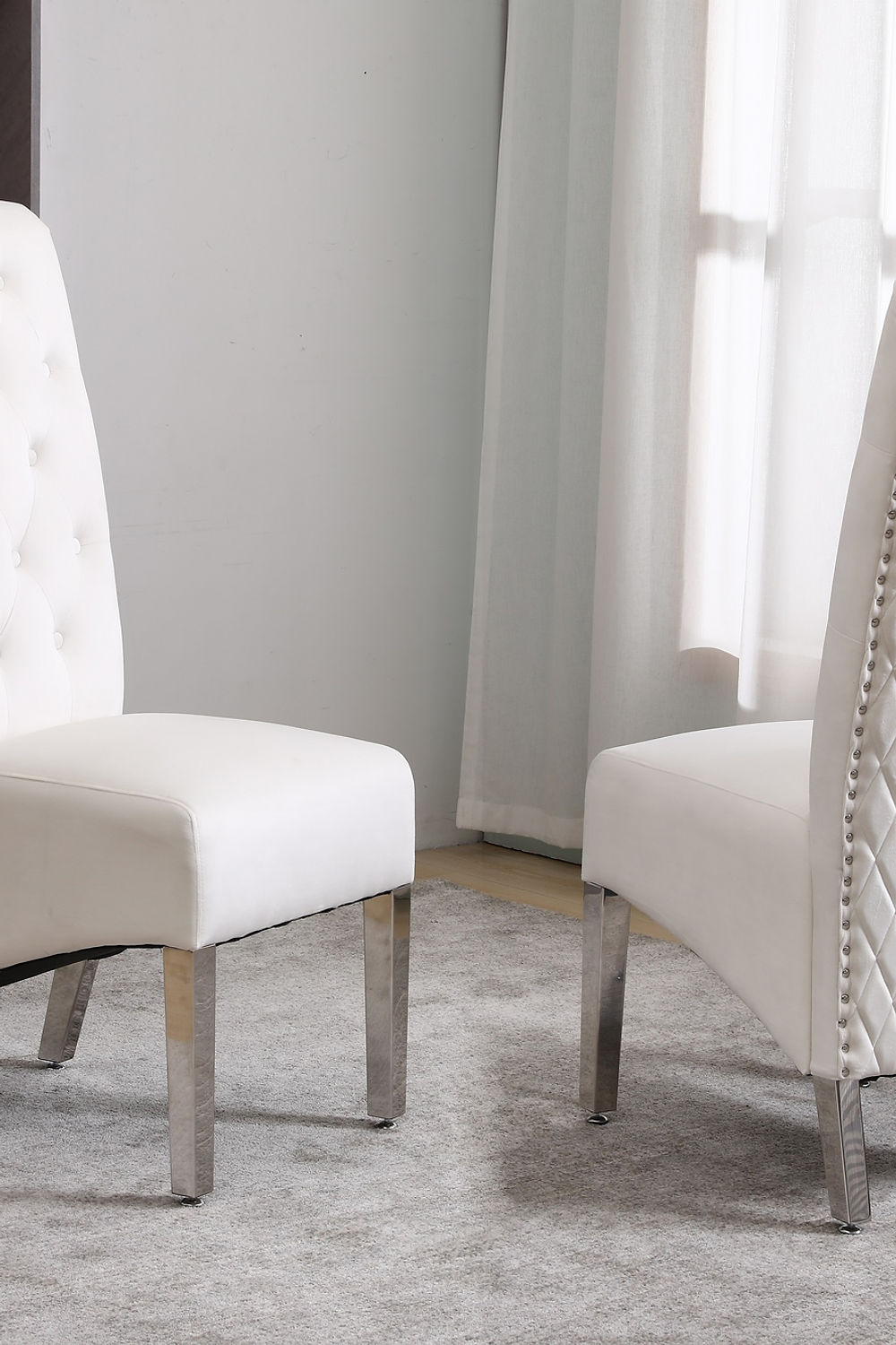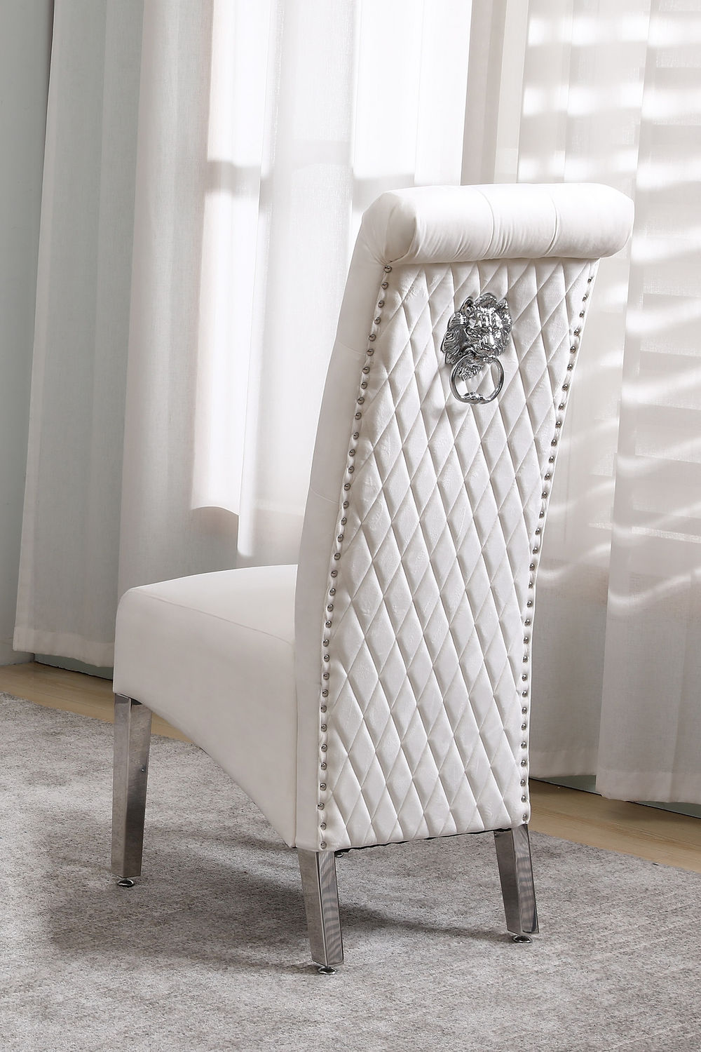 Silla de comedor de terciopelo color crema con costuras con diseño de rombos, capitoné profundo, aldaba de león, patas de cromo pulido y detalles de cabeza de clavo.