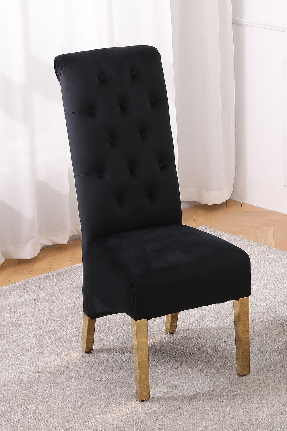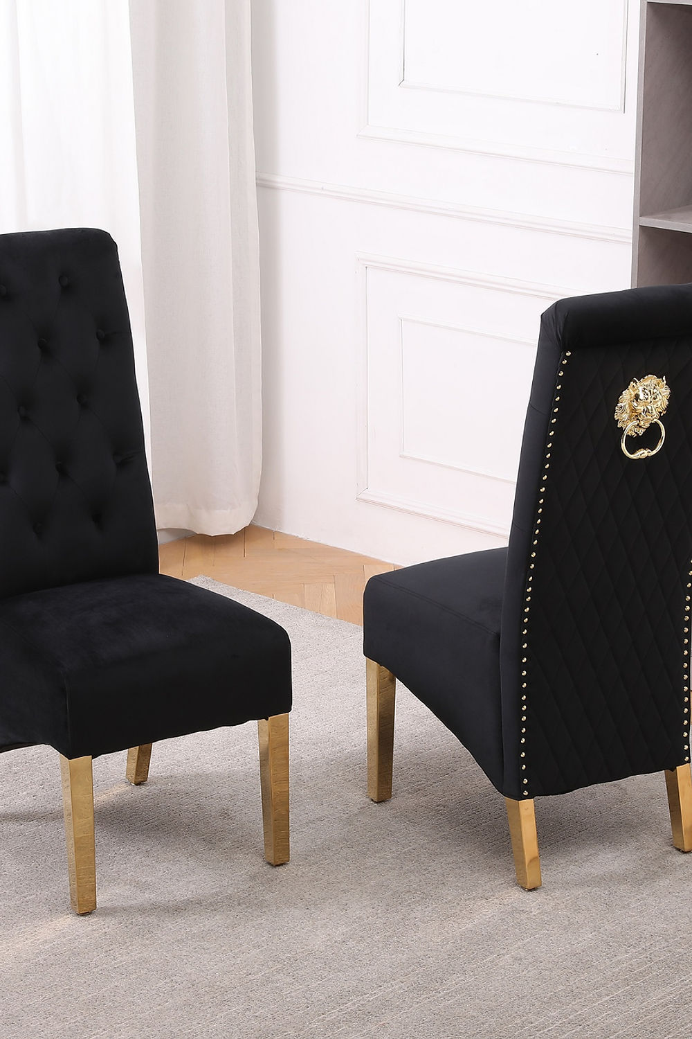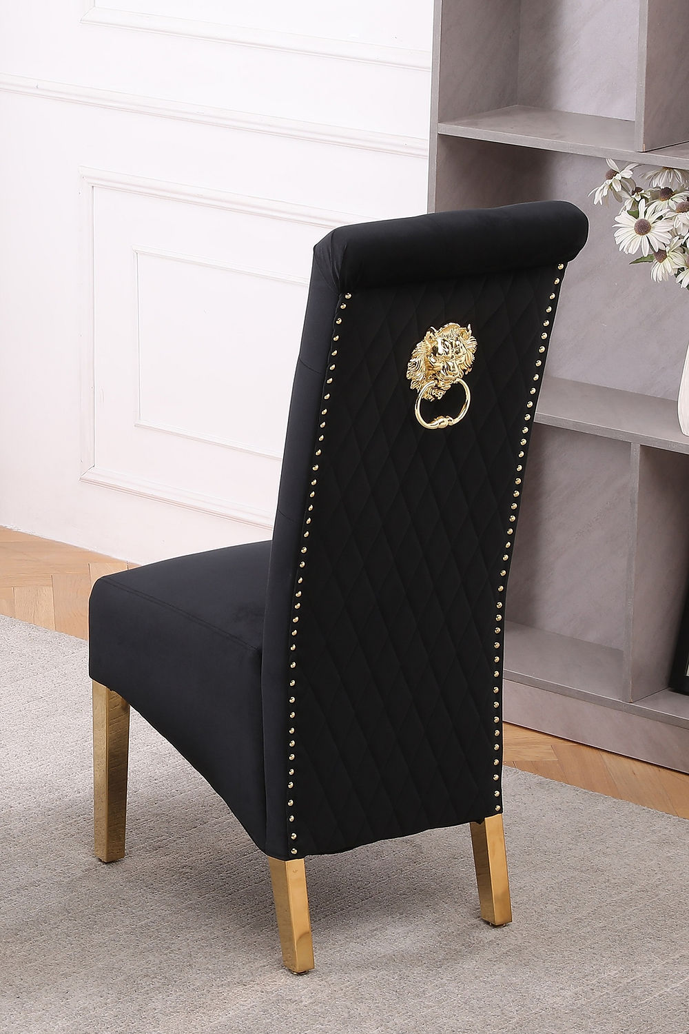 Silla de comedor de terciopelo negro con costuras con diseño de rombos, mechones profundos, aldaba de león, patas doradas pulidas y detalles de cabeza de clavo.