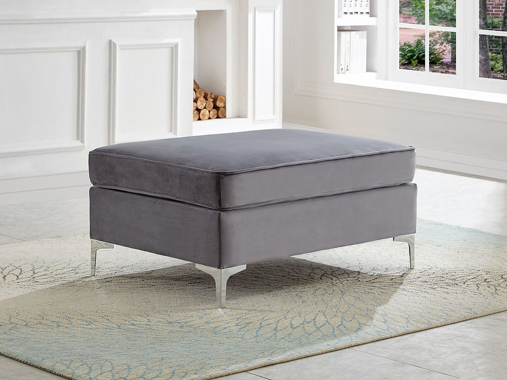 Terciopelo gris con detalles de capitoné profundo y clavos, patas cromadas y almohadones decorativos.