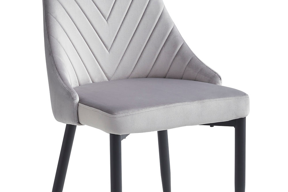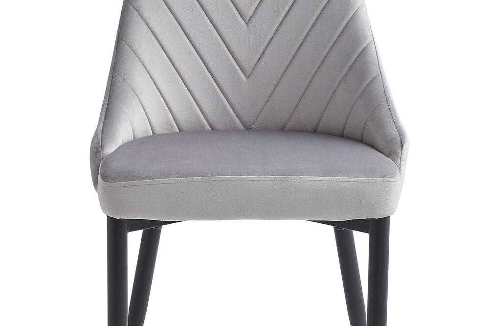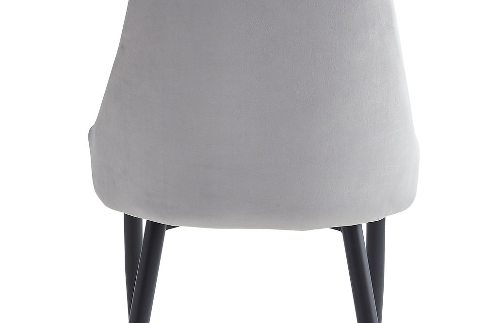 Sillas: Terciopelo Gris Claro con Detalles de Costuras, Patas de Acero Negro.