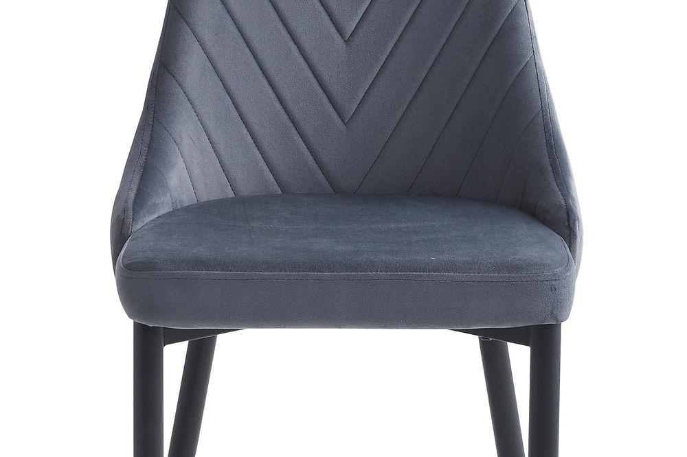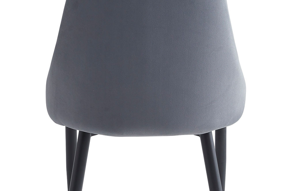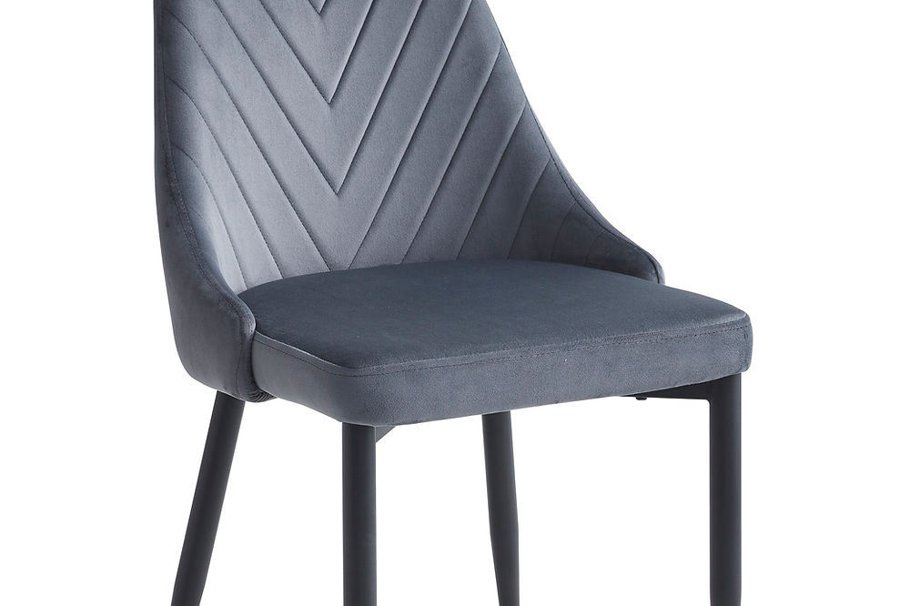 Sillas: Terciopelo Gris Oscuro con Detalles de Costuras, Patas de Acero Negro.