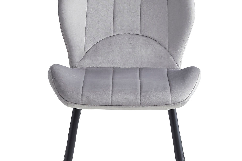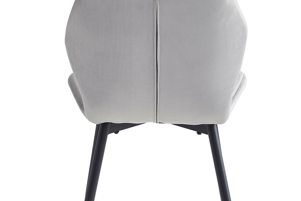 Sillas: Terciopelo Gris Claro con Detalles de Costuras, Patas de Acero Negro.