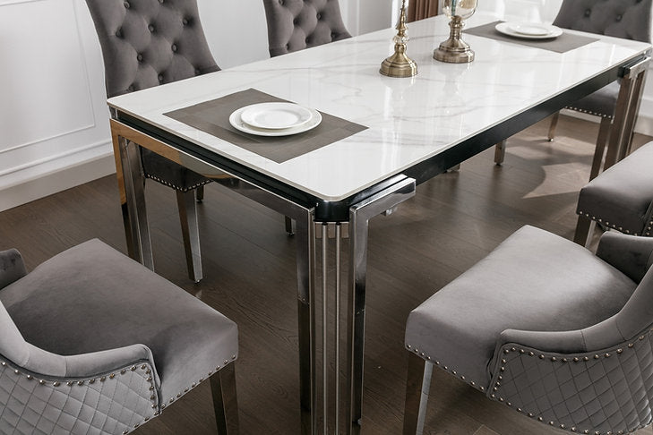 Chairs: Grey Velvet with Lion Knocker, Polished Chrome Frame, Diamond Studded back and Nail Head Details.