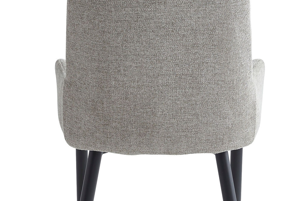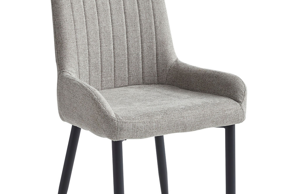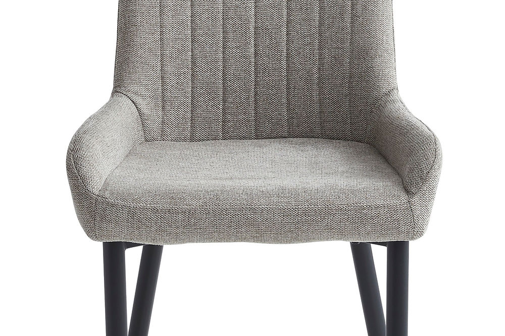 Chairs: Grey Fabric with Stitching Details, Black Steel Legs.