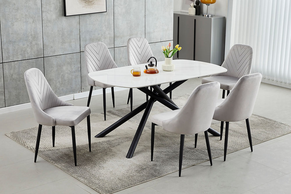 Chairs: Light Grey Velvet with Stitching Details, Black Steel Legs.