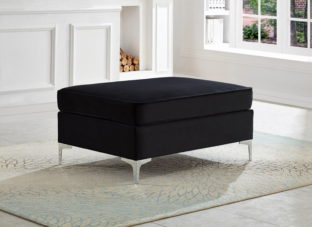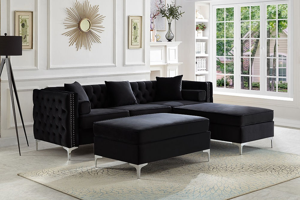 Black Velvet Reversible Sofa Sectional With Deep Tufting and nail head Details, Chrome legs and Accent Pillows.